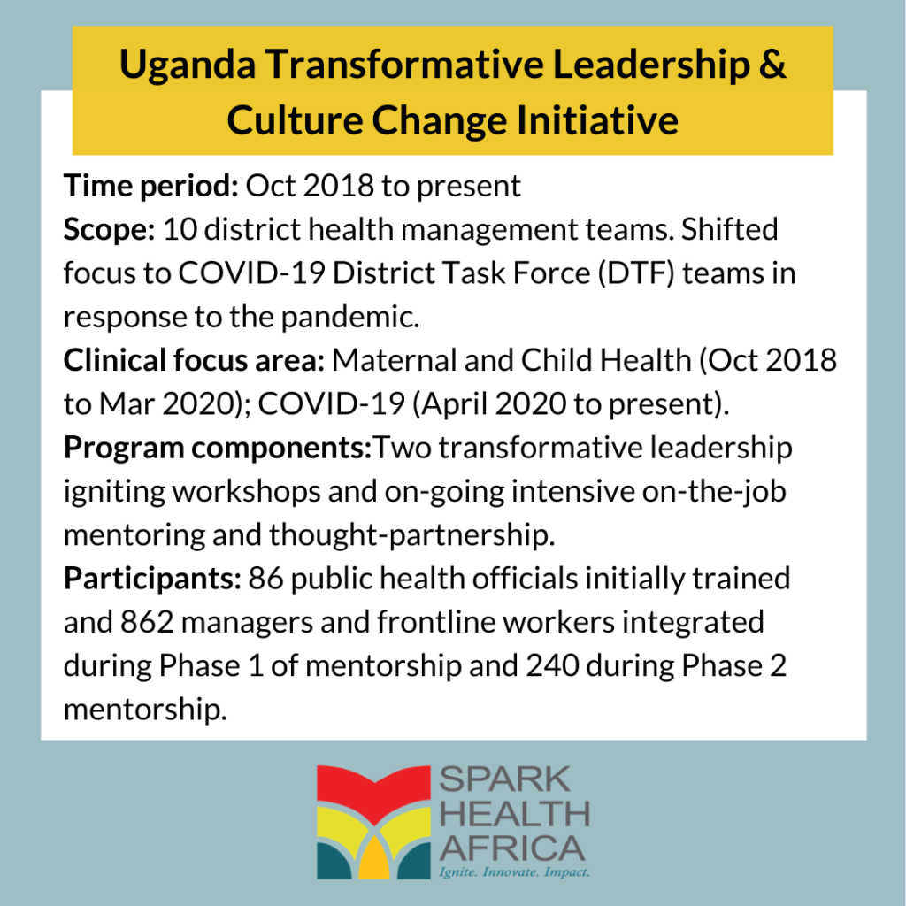 The Ugandan Ministry of Health partnered with Spark Health Africa in 2018 to conduct a transformative leadership and culture change initiative. The transformation journey for district health management teams starts with instructive training on a suite of modules covering management skills and leadership principles. Spark Health Africa then mentors the teams to hone core these skills into competencies (i.e., skills + knowledge + ability).