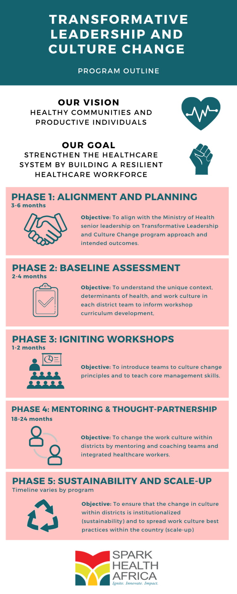 Our work as Spark Health Africa catalyzes the transformation from workgroups to effective teams with a strong work culture. We collaborate with African Ministries of Health for government-led Transformative Leadership and Culture Change initiatives.
