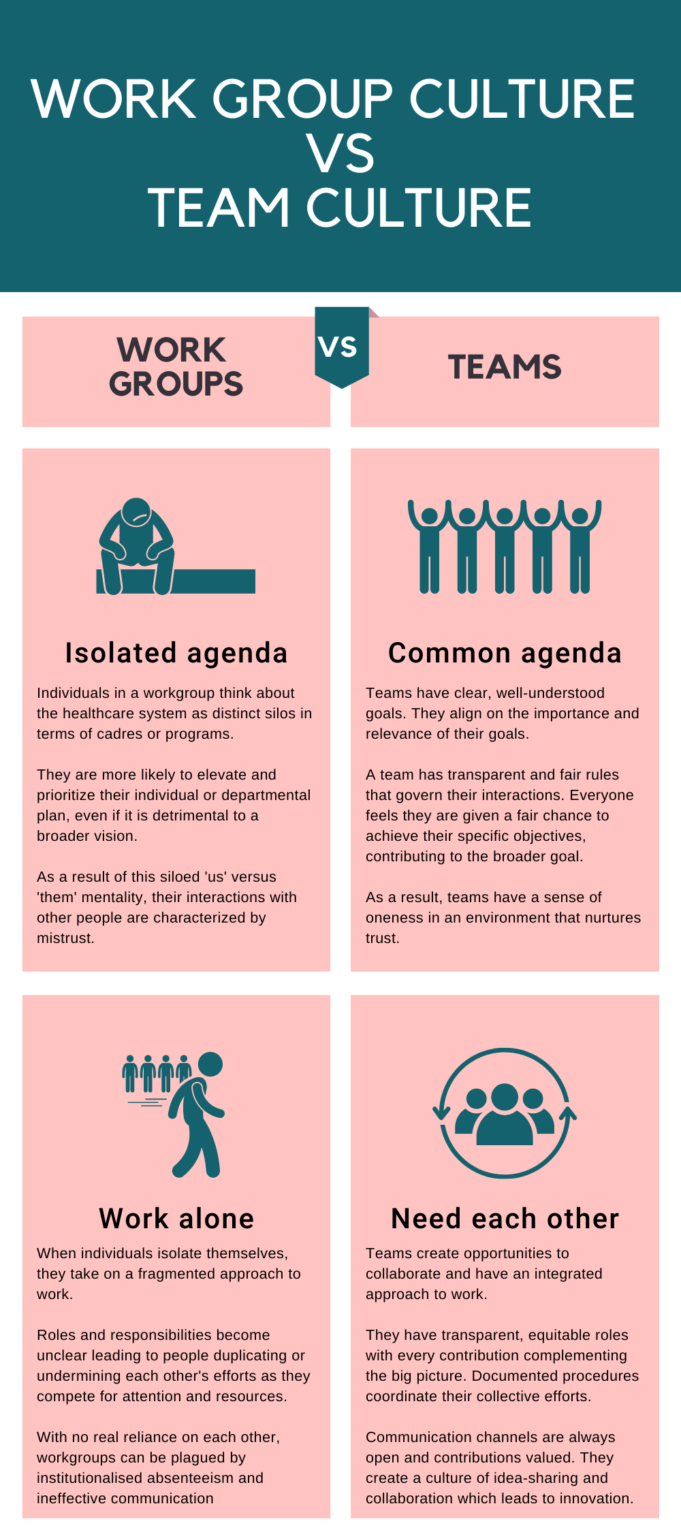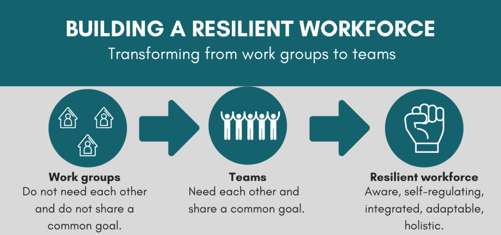 So how do we build a resilient workforce? The first step is to understand the shortfalls that prevent a workforce from reaching its full potential. The frequent barrier we come across is that healthcare workers function as workgroups, not as teams.