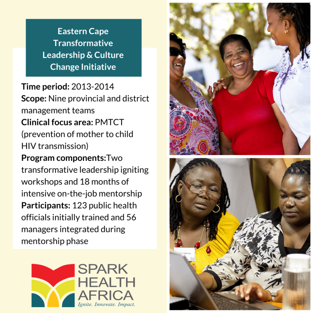 South Africa’s Eastern Cape Department of Health collaborated with Spark Health Africa in 2012 to embark on a Transformative Leadership and Culture Change (TLCC) initiative. Using the competencies that they developed as part of this initiative the provincial management team improved stock availability of all medicines and supplies from 54% to 95% over a six-month period.